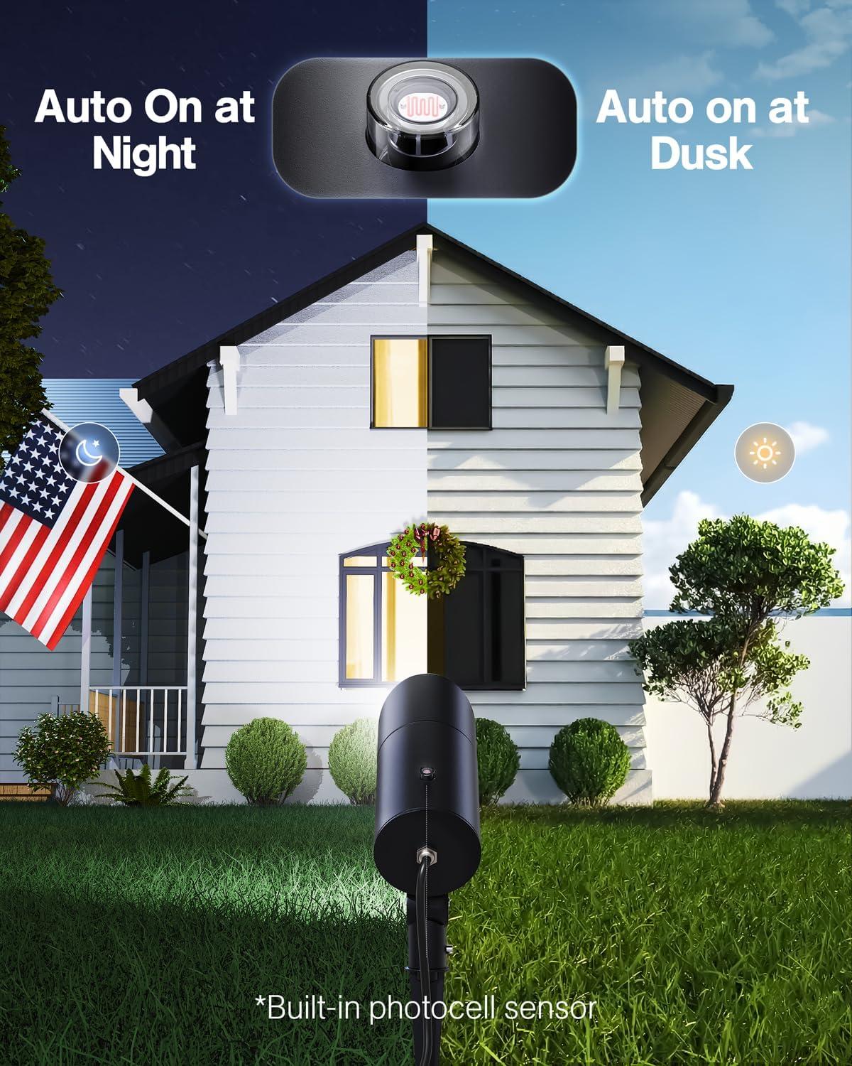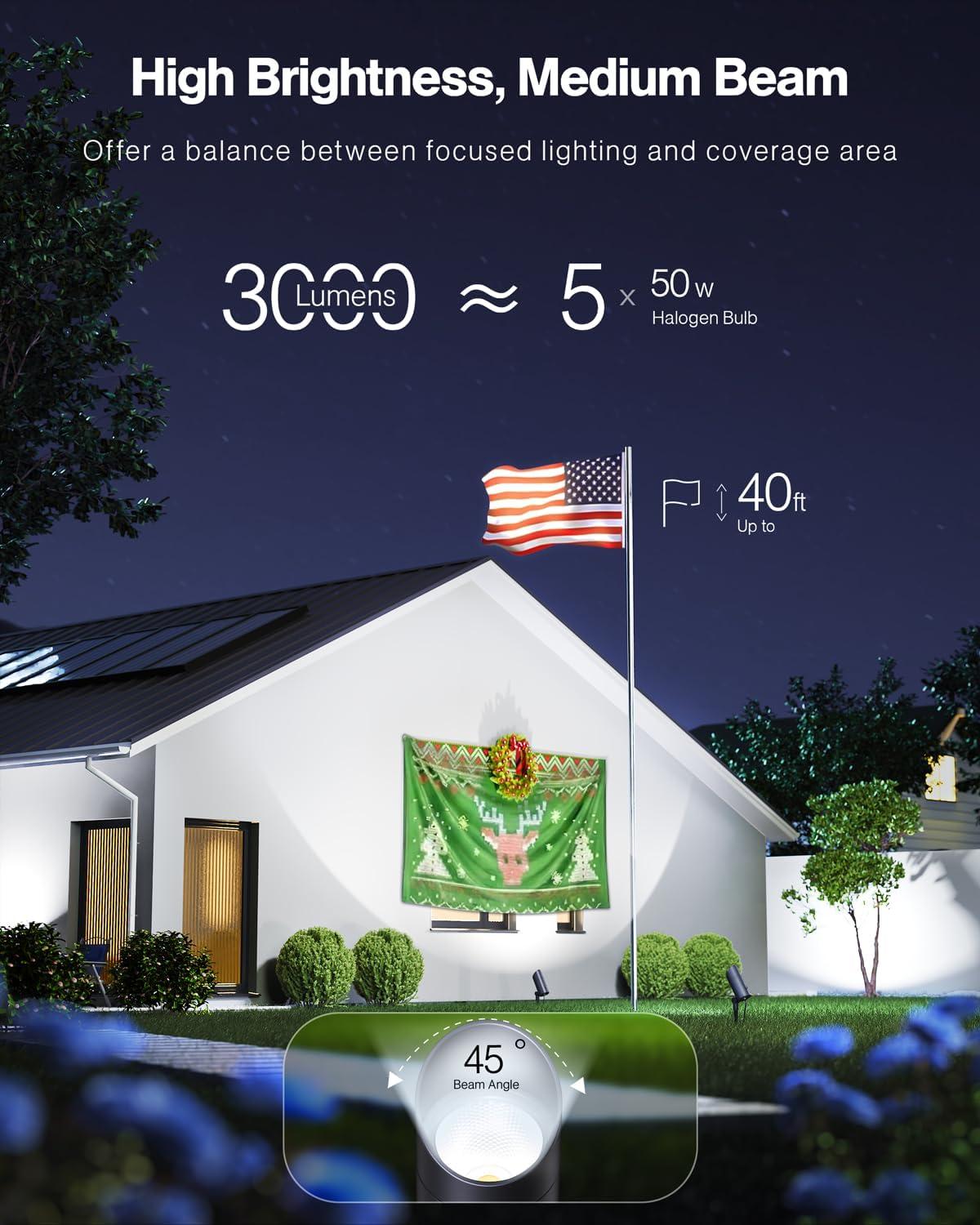 【Precise Lighting】With a 3000-lumen output and a 45° beam angle, casting light up to 40 feet. The light is also 180° adjustable, allowing you to focus the beam exactly where it's needed. Ideal for highlighting American flags, palm trees, statues, or for providing broad lighting coverage for pathways, lawns, and driveways