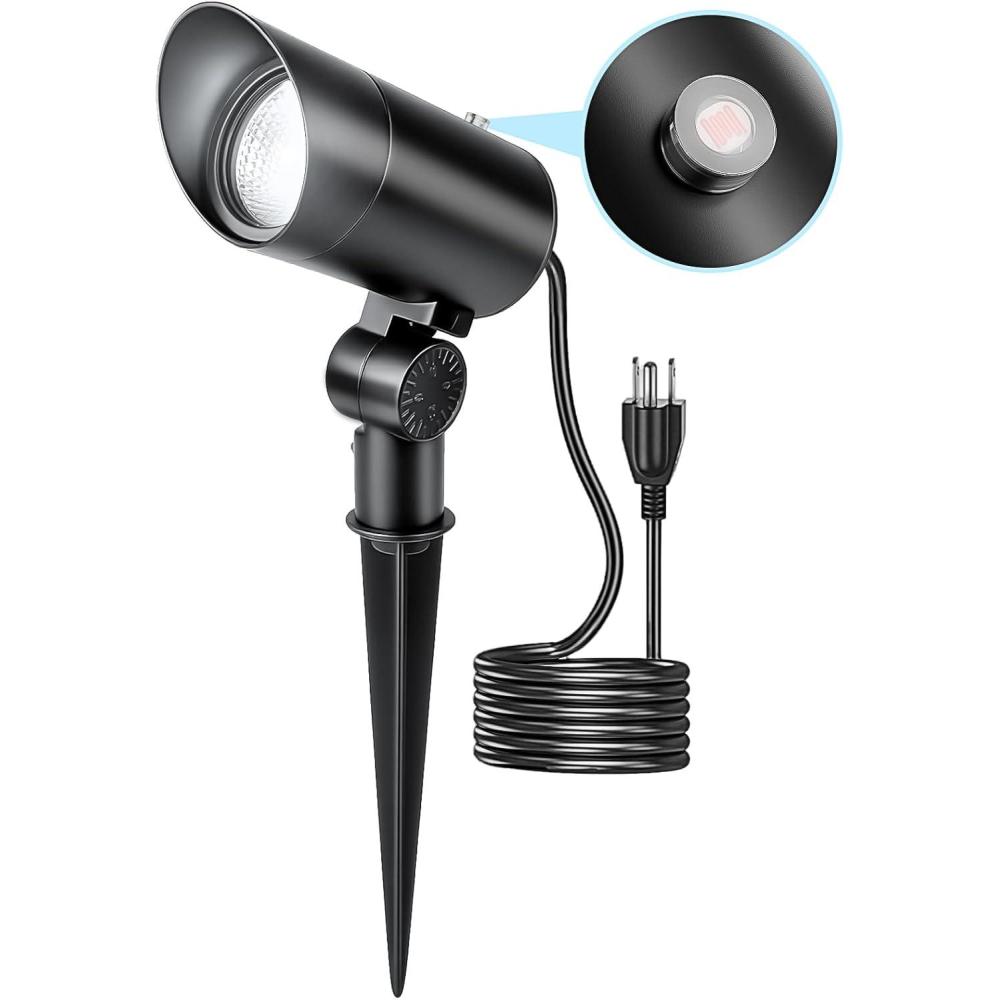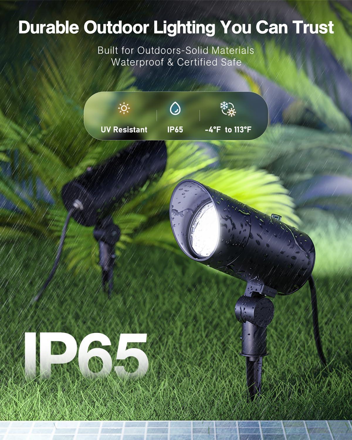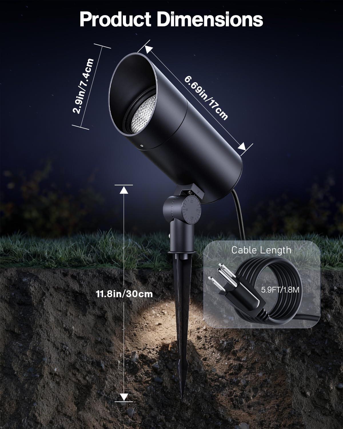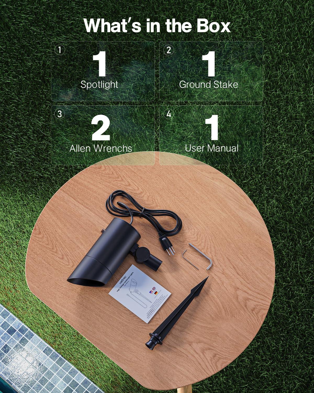 【Durable Aluminum Material】Constructed with IP65 waterproof rating, heavy duty die-cast aluminum housing, and a glass lens cover, this spotlight withstands rain, snow, and other harsh weather conditions. The all metal ground stake design allows for easy installation into the ground. Ensuring reliable long-term outdoor use