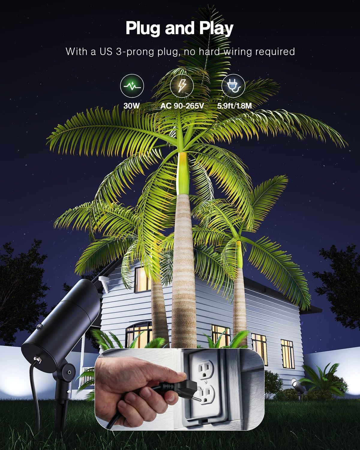 【Plug-and-Play】5.9FT/1.8M cord with a 3-Plug allows quick set up—no hardwiring required. This spotlight operates within an AC voltage range of 90V to 265V. Simply plug it into a compatible outdoor waterproof power outlet, and you're ready to use! No electrician required, making installation quick and easy