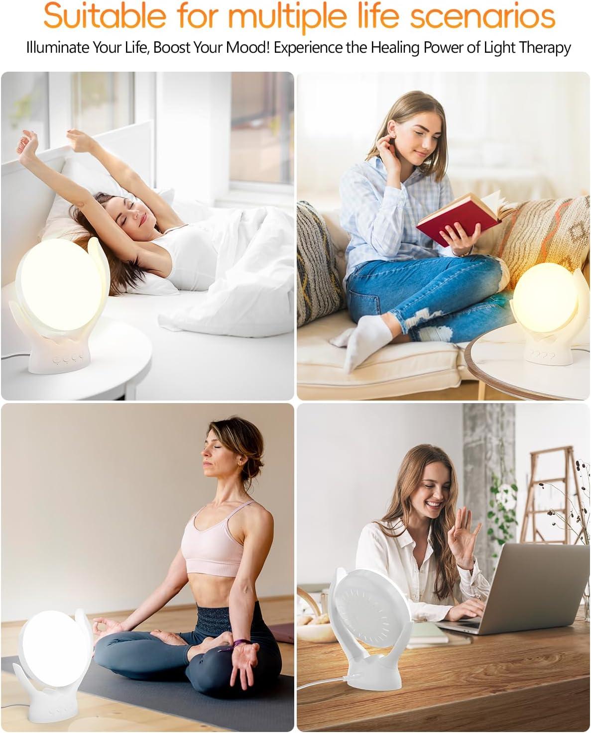 【Therapy Lamp for Various Life Scenarios】: This light therapy lamp can be used in various life scenarios, such as practicing yoga, reading before bedtime, in the morning, and during work. Its bright and natural light can help improve mood, increase energy levels, and promote better sleep. Whether you need a boost of energy in the morning, a calming light for yoga, or a way to combat winter blues, jet lag, shift work, and seasonal changes, this light therapy lamp is a great choice.