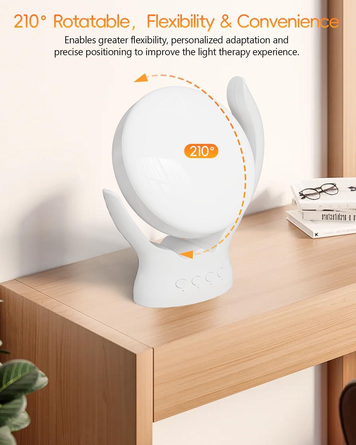 【210°Adjustable Lighting Angle】: This light therapy lamp features a 210-degree adjustable lighting angle, allowing you to customize the direction of the light to your preference. With this feature, you can easily adjust the lamp to shine light on your face, body, or any other area that needs a boost of natural light. The lamp's flexible design also makes it easy to use in a variety of settings, whether you're at home, in the office, or on the go.