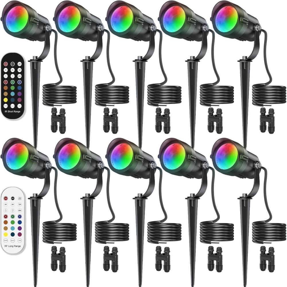 HIBOITEC RGBW Low Voltage Landscape Lighting 10Pack 12W with Remote Connectors Spotlights Landscape Lights 12-24V AC/DC Waterproof for House Yard Trees Outdoor Christmas(Transformers NOT Included)(10 Pack)
