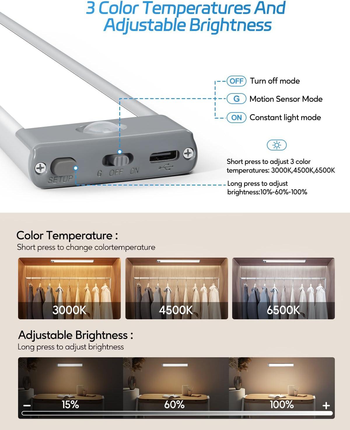 【Color Temps Adjustable, Brightness Adjustable】These closet lights are designed with three color temperatures, warm light (2800-3000K), natural light (4000-4500K), and white light (6000-6500K) . Buy one and enjoy three different colors of lights. Adjustable brightness is another exclusive new feature of ours, which supports stepless dimming from 10% to 100%. You can choose different color temperatures and brightness according to the scene.