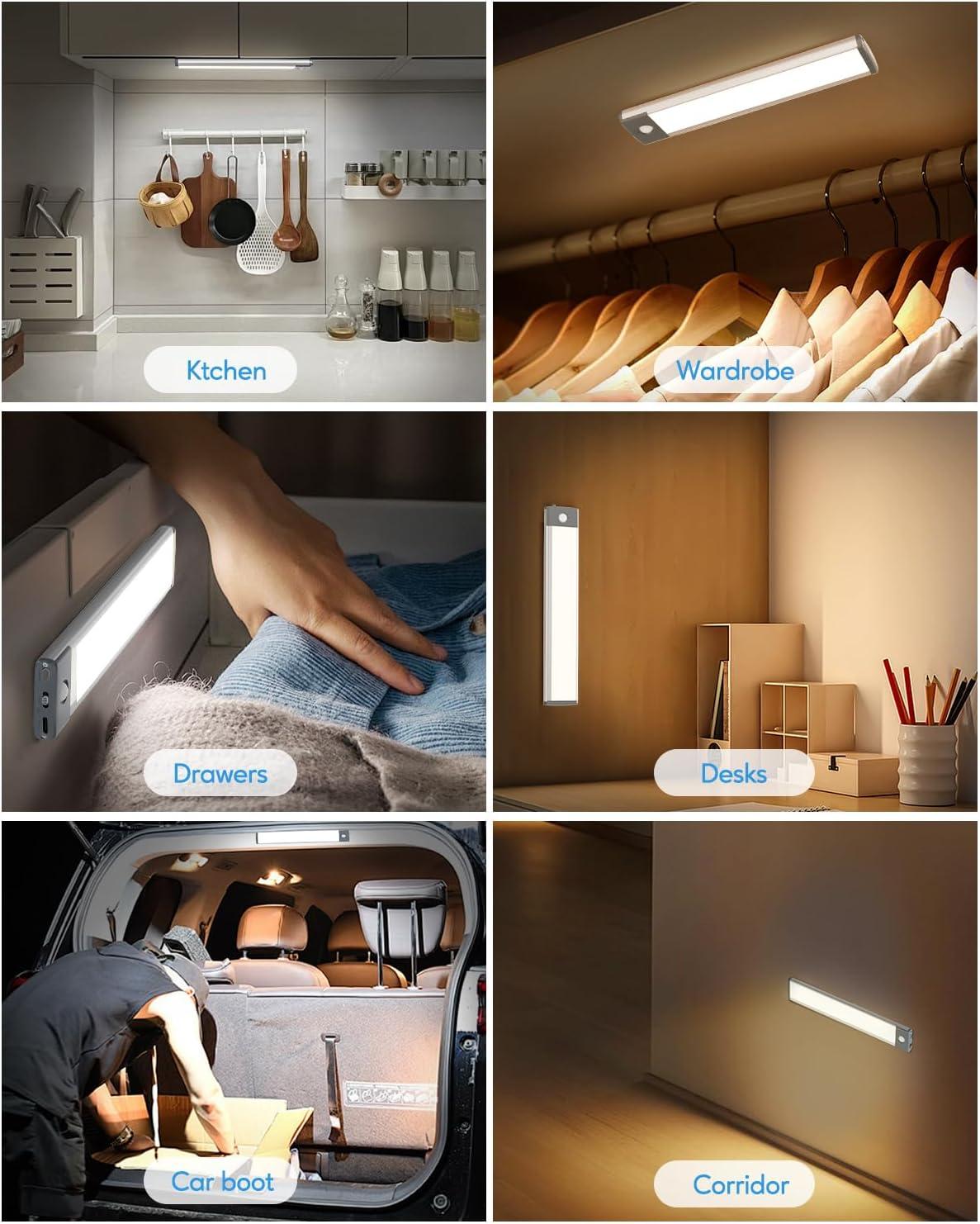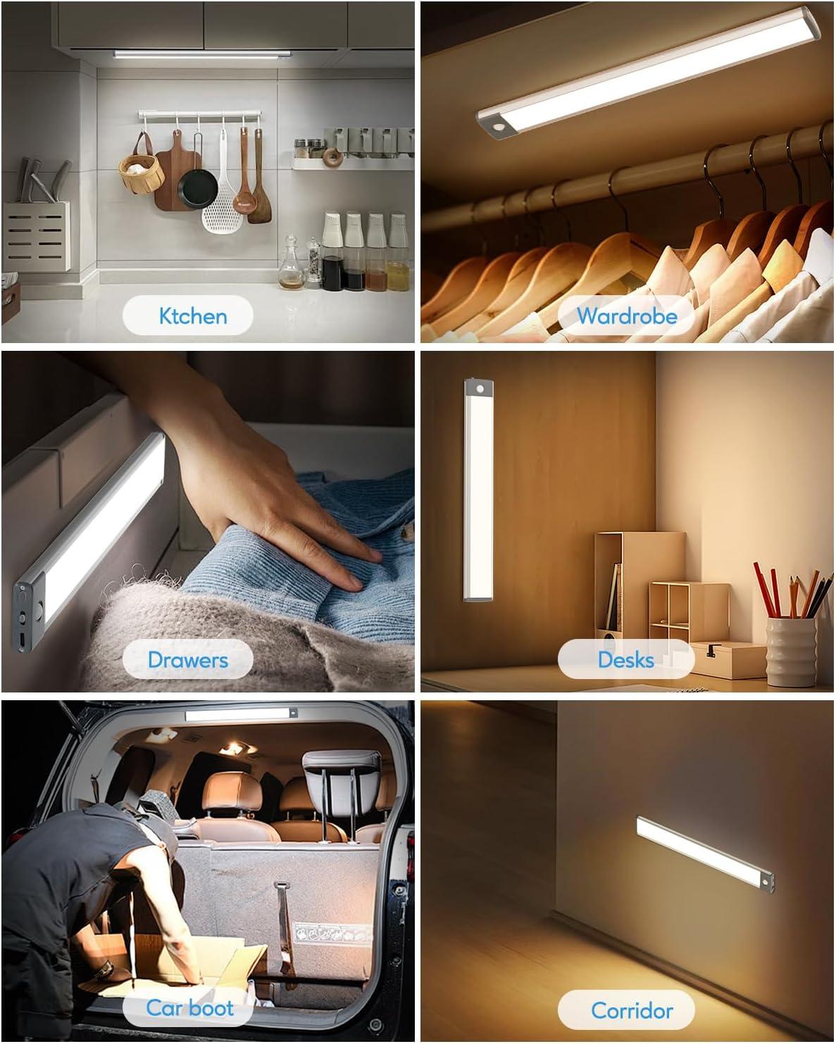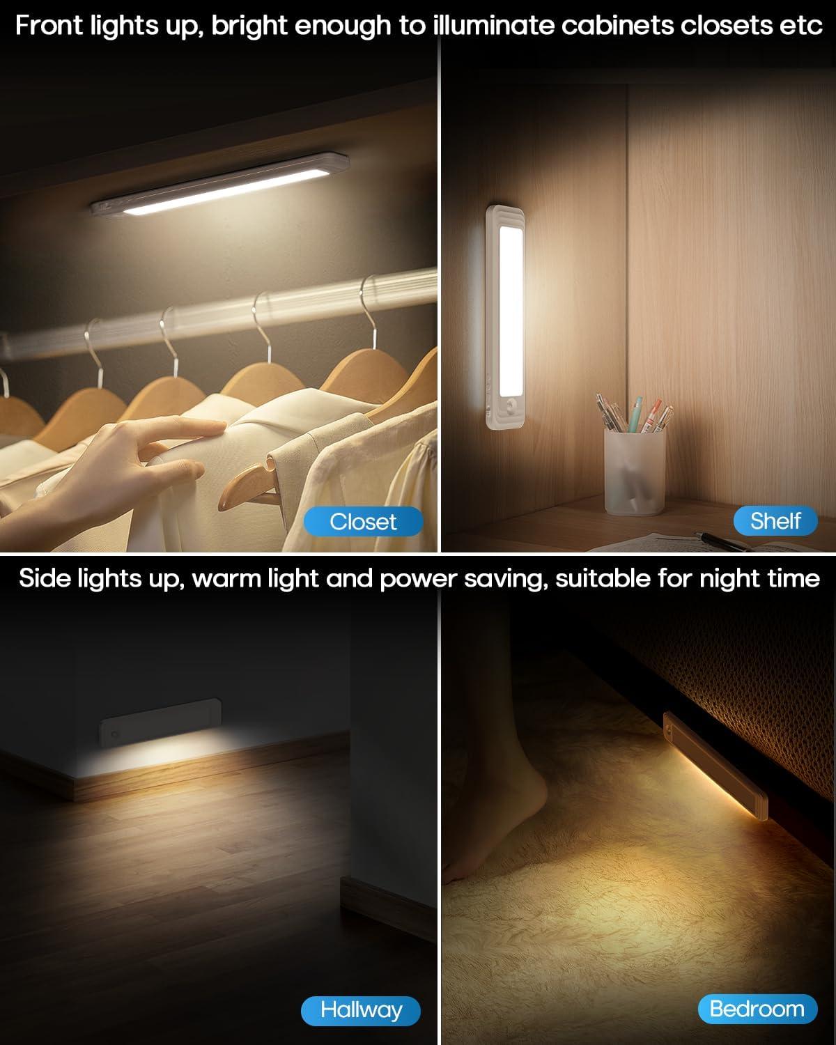 【Easy to Install, Wide Application】This led motion sensor cabinet light has built-in magnetic that can easily stick on any iron surface. It also comes with adhesive tapes and magnetic sheets ensuring it can stick on any non-iron surface. The magnetic design allows the led light bar to be easily taken off for charging or changing positions, perfect for bedrooms, cabinets, workshops, basements, garages, hallways, stairwells, and etc.