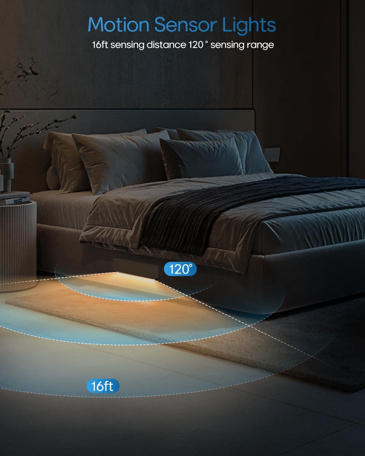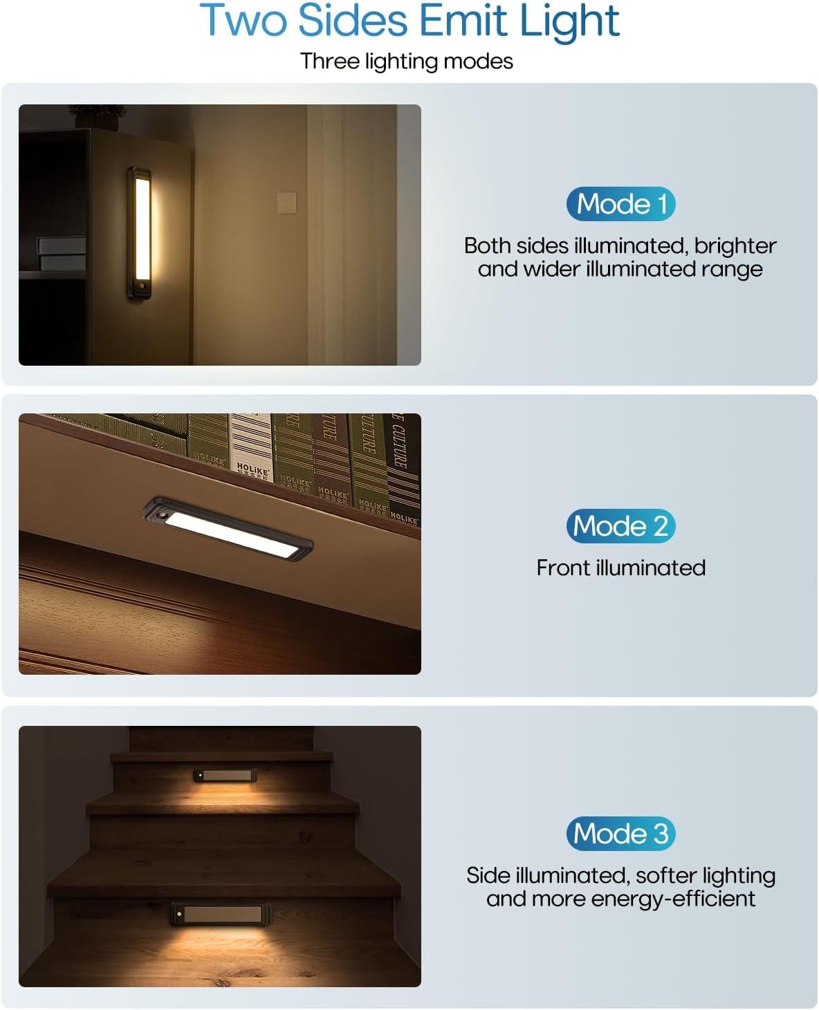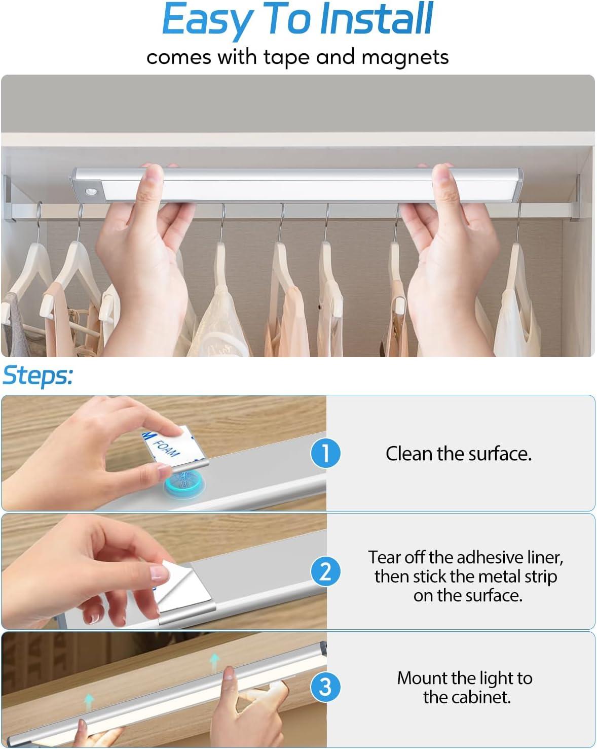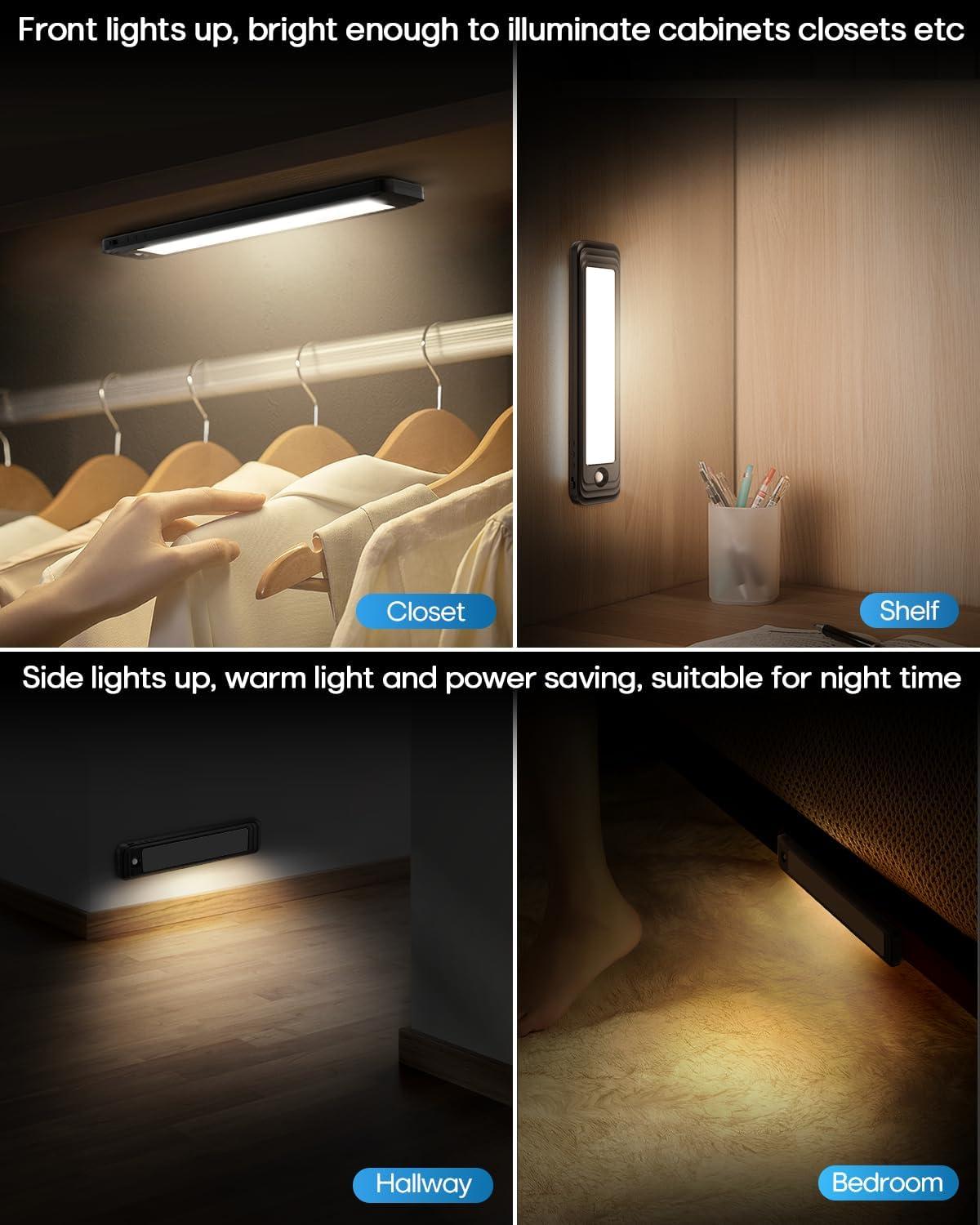 【Easy to Install, Wide Application】This led motion sensor cabinet light has built-in magnetic that can easily stick on any iron surface. It also comes with adhesive tapes and magnetic sheets ensuring it can stick on any non-iron surface. The magnetic design allows the led light bar to be easily taken off for charging or changing positions, perfect for bedrooms, cabinets, workshops, basements, garages, hallways, stairwells, and etc.