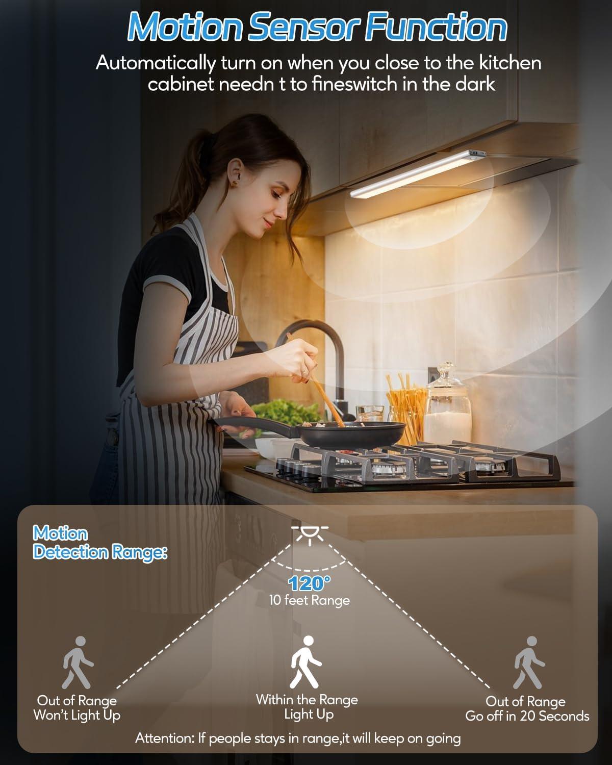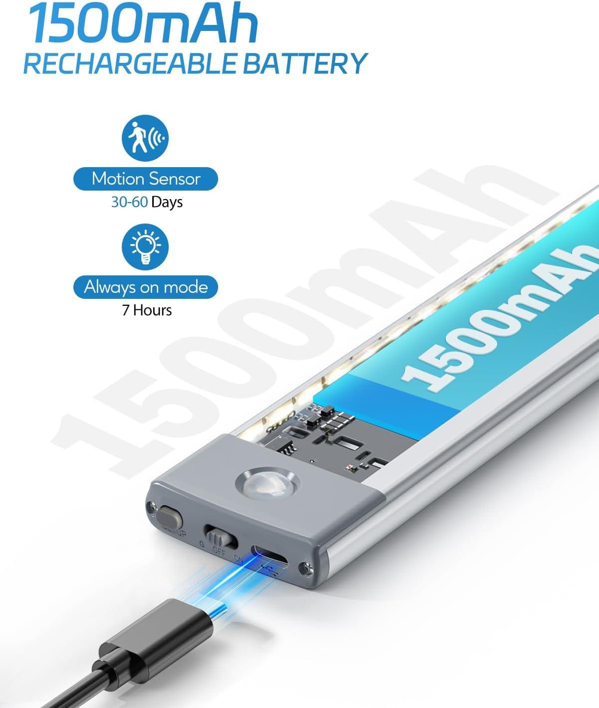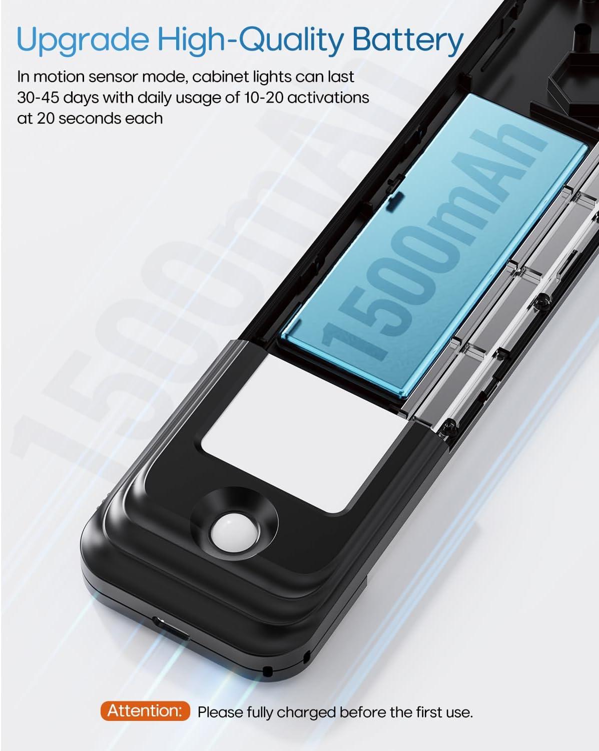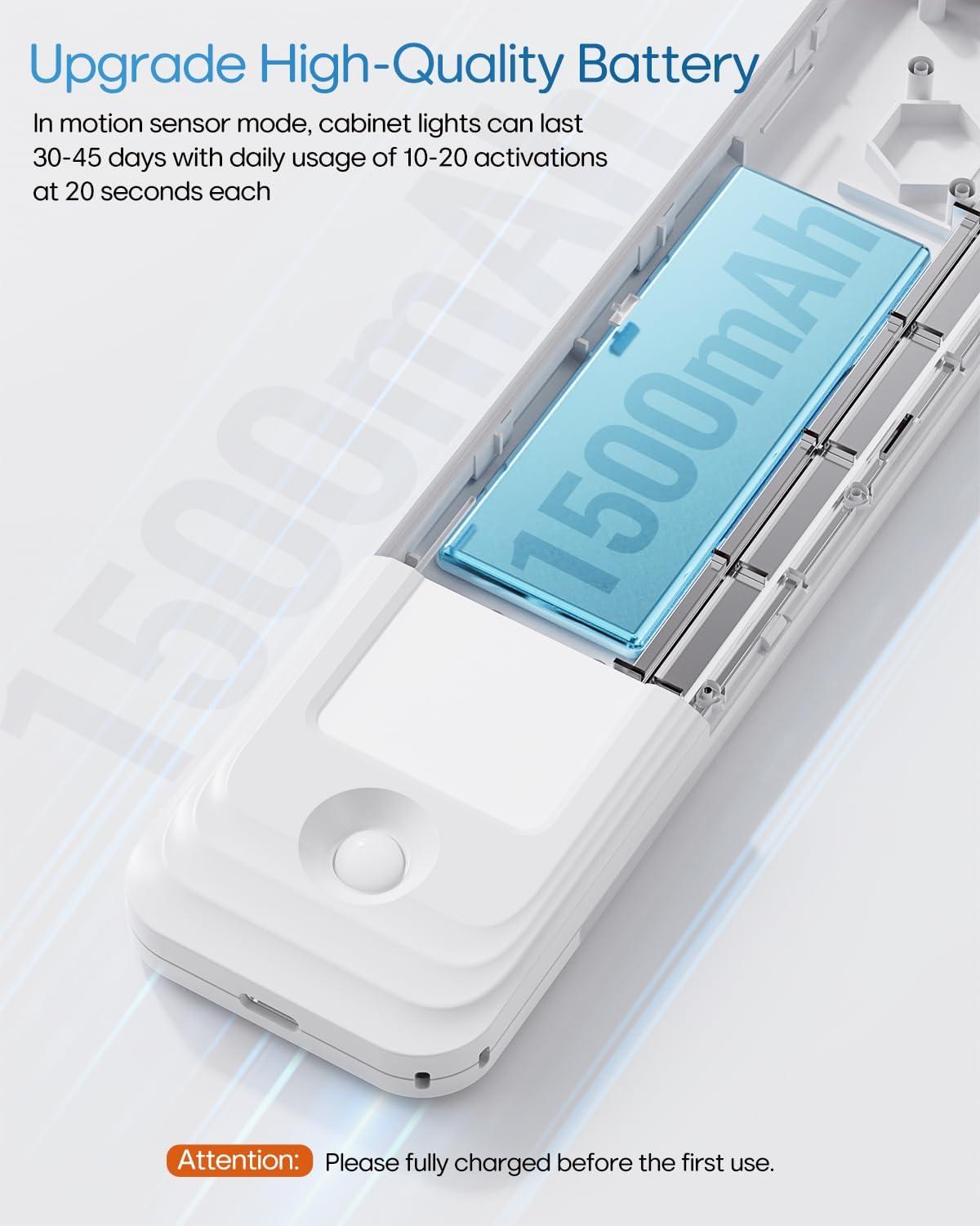 【Rechargeable Battery, Larger Capacity】Built-in 1000 mAh high-capacity rechargeable battery, has a larger battery capacity than other led light bar, quickly charged via USB. After fully charging, these under counter lights for kitchen last up to 5 hours under on mode and 1-2 months under motion sensor mode. No need for AAA batteries anymore. Energy Save & Save More Money!