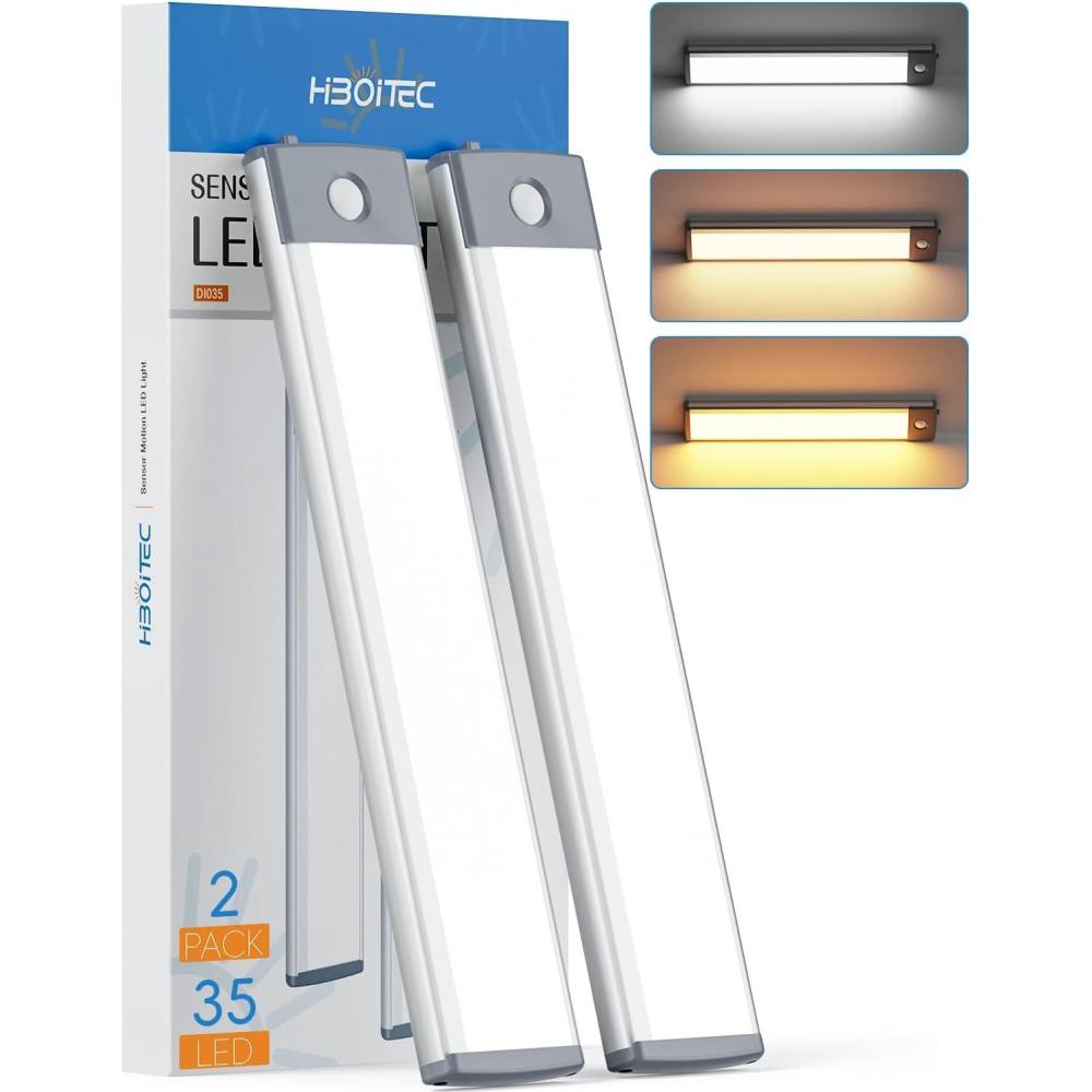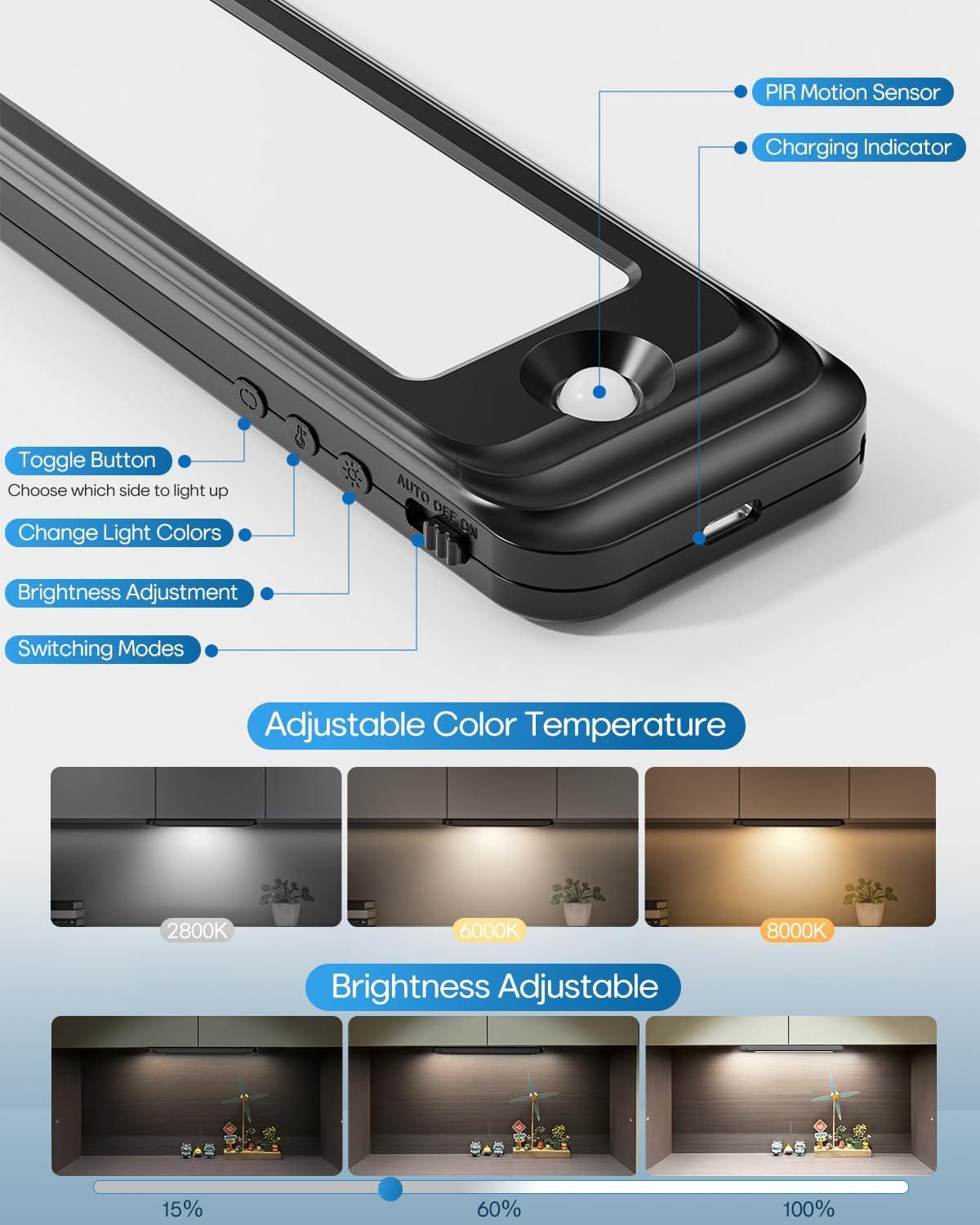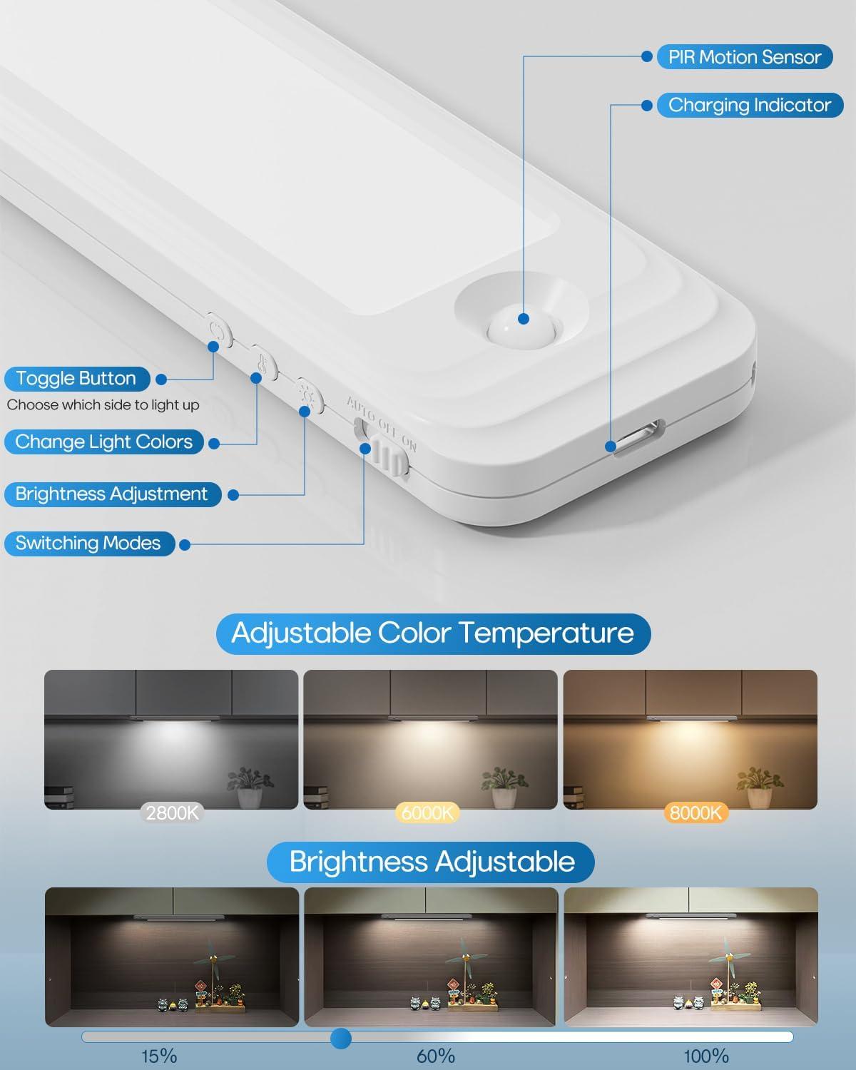 【35 LEDs Upgrade Motion Sensor Light】Our Under cabinet lighting adopts a new design of 35 LEDs per light, with a brightness of up to 210 lumens, brighter but not dazzling. 3 color temperatures adjustable designs and brightness adjustable design are our exclusive features. With a 1000mAh rechargeable battery and motion sensing and night sensing functions, it is energy-saving and environmentally friendly. It is the perfect choice for your home lighting.